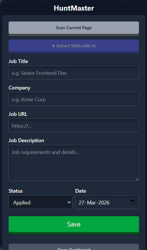 Drawing from my own job search struggles, I built a smart browser extension that lets you capture job postings instantly from LinkedIn and other platforms, coupled with AI-powered skill extraction from job descriptions. Track every application through clear statuses, view real-time progress statistics on a clean dashboard, and manage everything through an intuitive side panel.